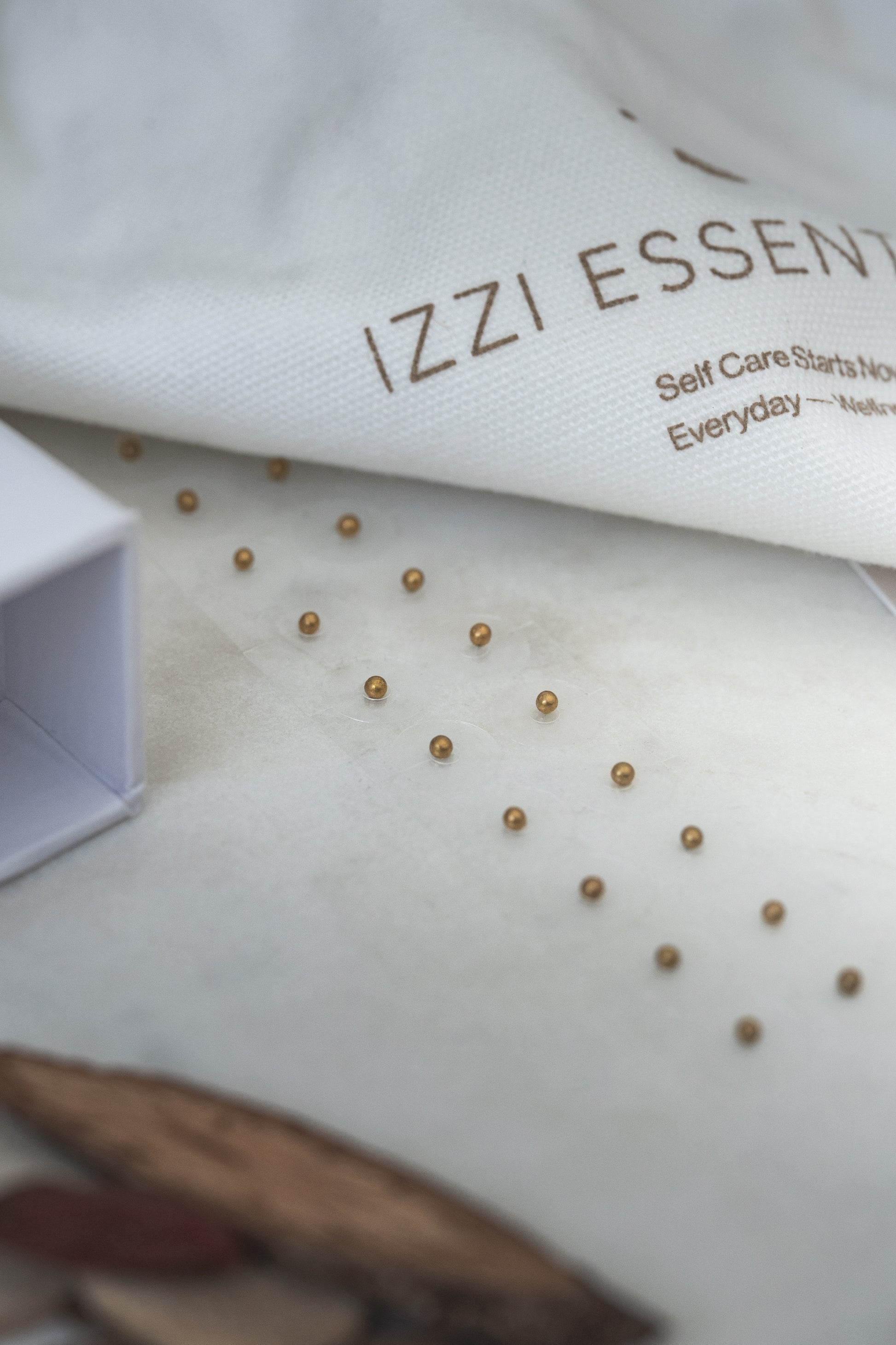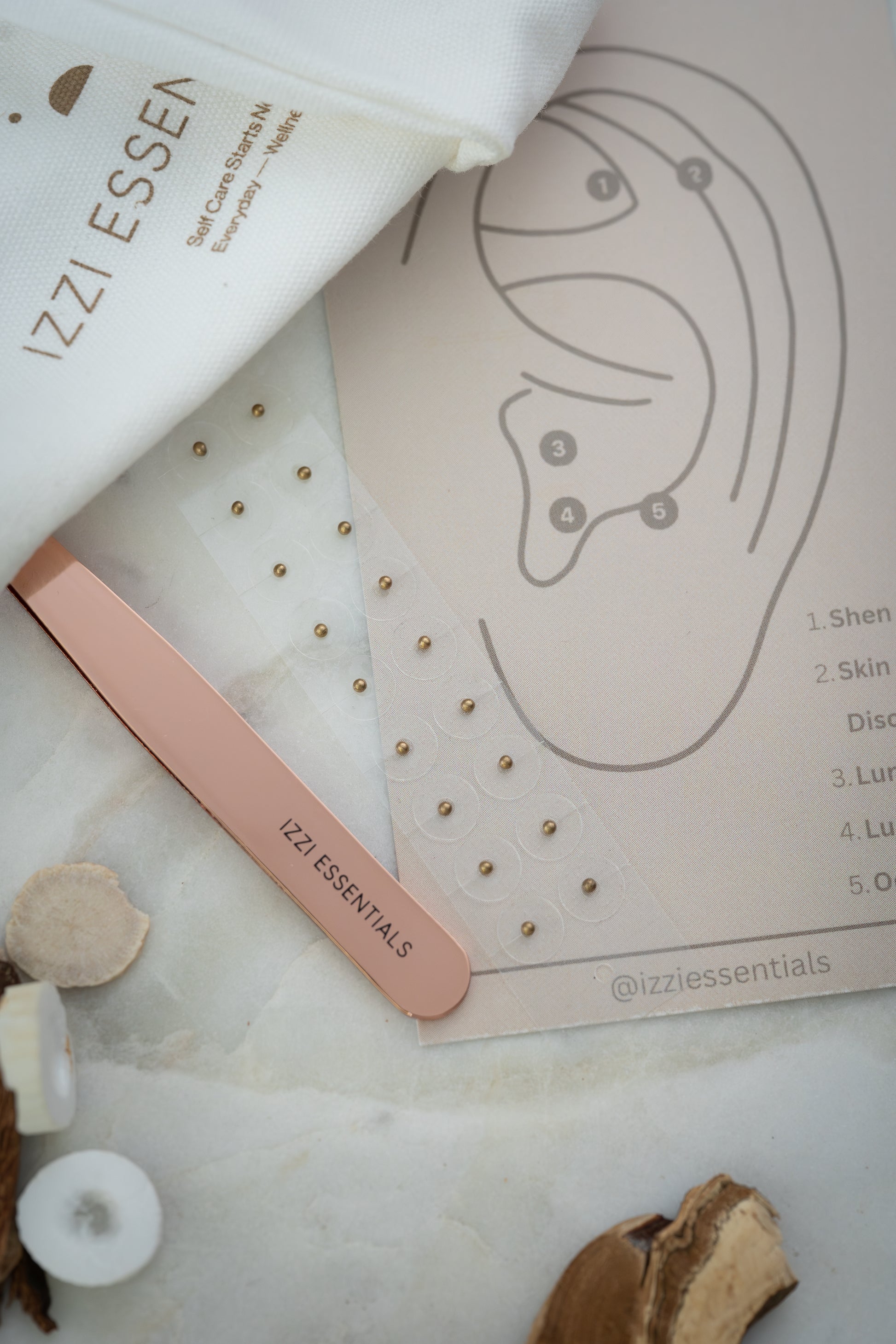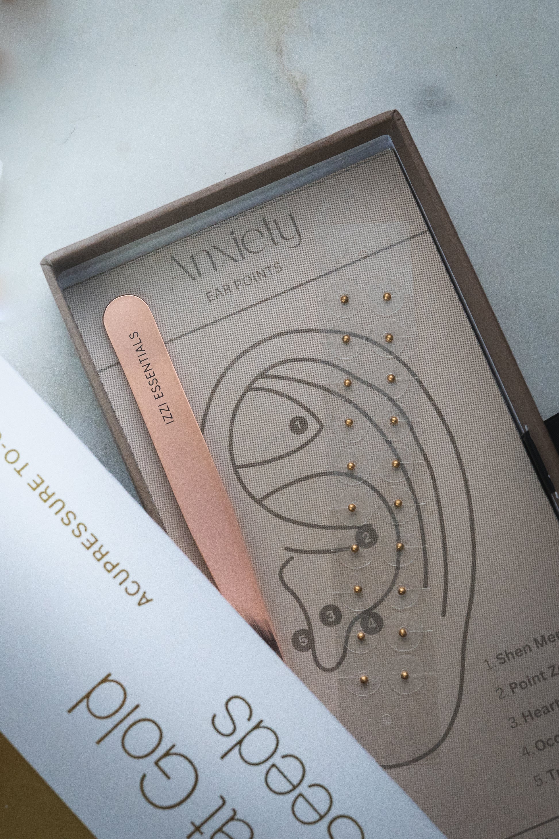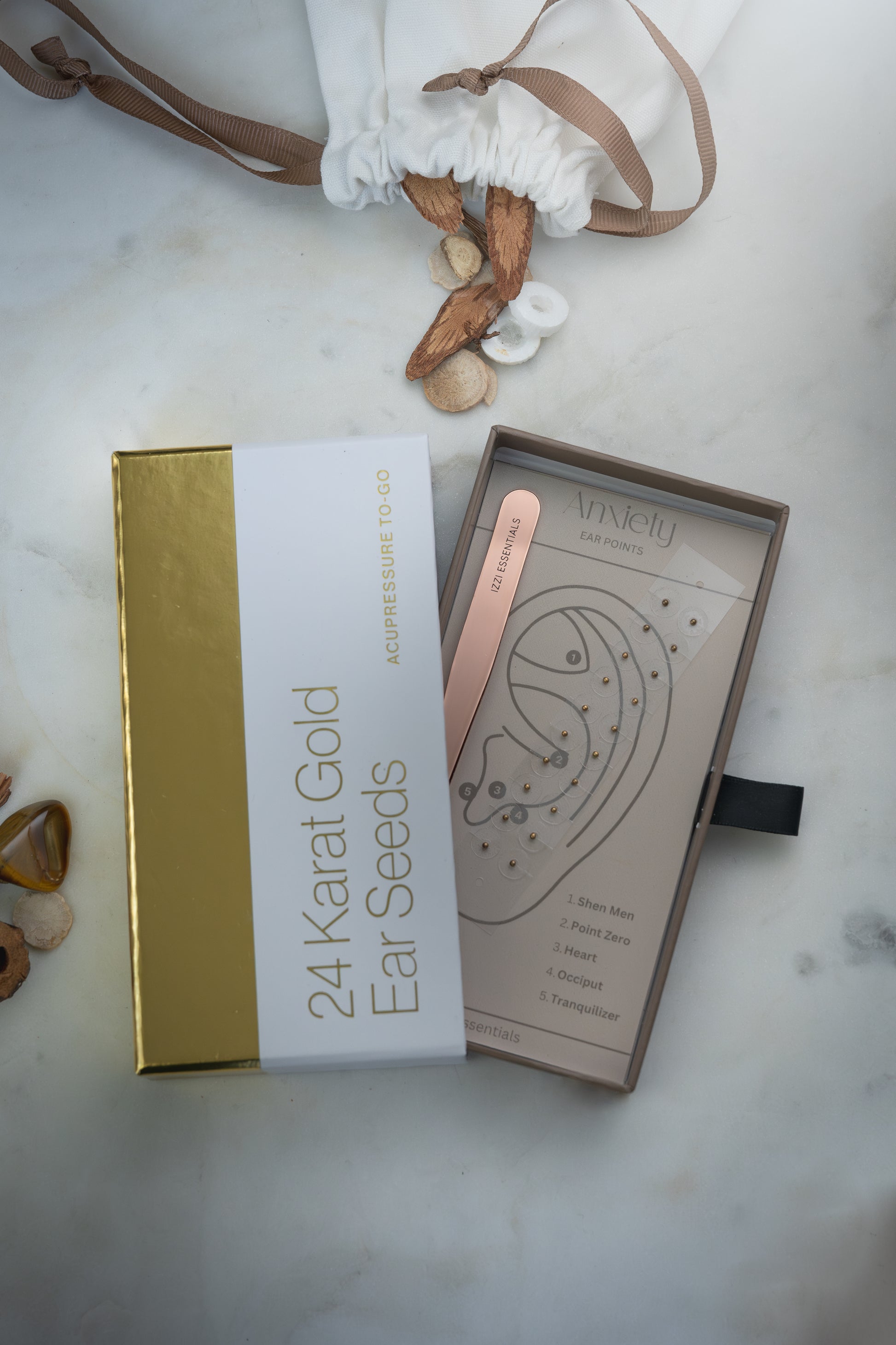 This elegant take home acupressure kit includes 24 karat gold plated ear seeds.