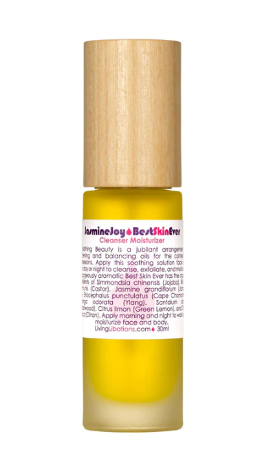 Living Libations best skin bathing beauty, Jasmine Joy Best Skin Ever is a jubilant composition of skin brightening and balancing oils and essences. This complexion calming and body loving Libation is a heavenly moisturizer, clarifying cleanser, and faithful skin harmonizer. The glamorous-amorous aroma of euphoric Jasmine will absolutely scintillate the senses and tantalize noses.