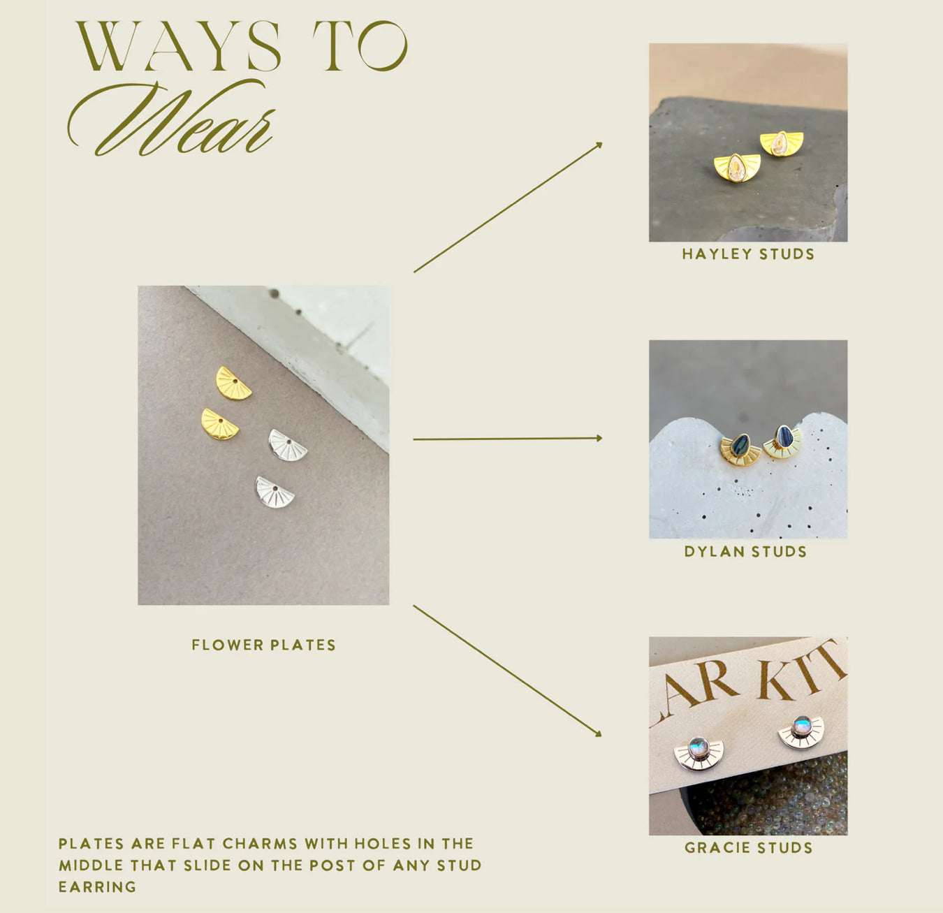 plates are flat charms with holes in the middle that slide on the post of any stud earring, for example - pair with opal circle, star studs or tiny black studs